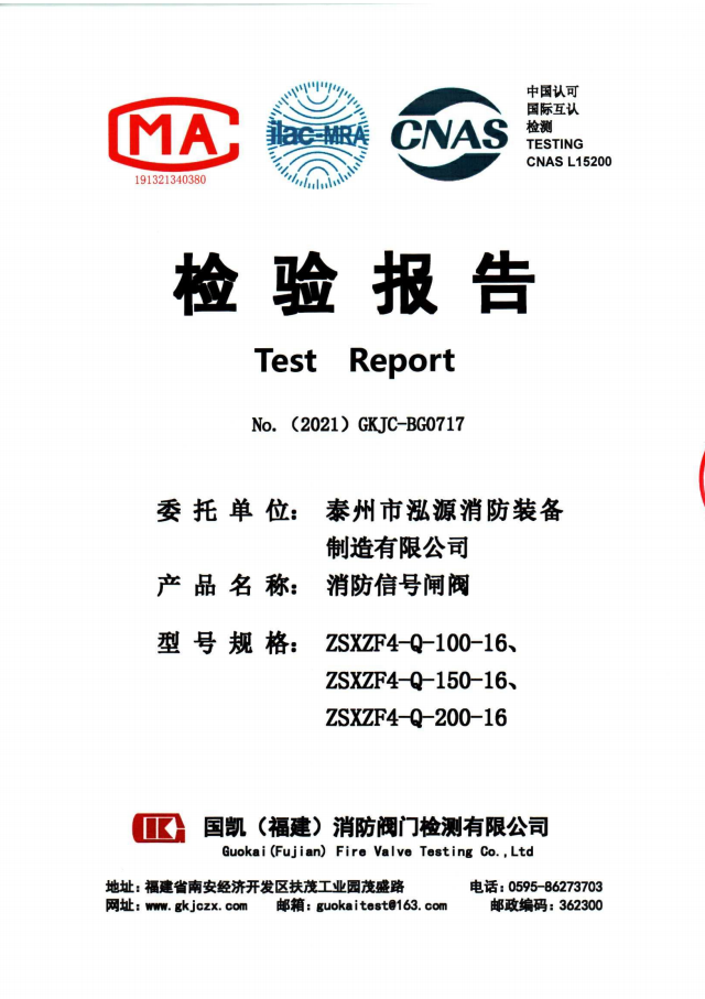 啟真法蘭消防信號(hào)閘閥ZSXZF4-Q檢驗(yàn)報(bào)告